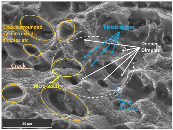 As temperatures increase, the Al6082 alloy undergoes the formation of an oxide layer, develops the presence of phase particles in dimples, and plastic deformation ahead of the crack tip, among other mechanisms [49]. These factors contribute to the phenomenon of crack closure. In Figure 6, SEM images reveal many similar observations which collectively suggest the occurrence of crack closure during certain stages of the loading cycle.