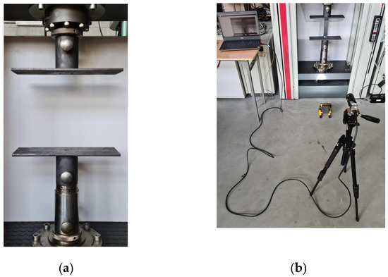 Experimental test stand: (a) experimental test heads, (b) general view of the test stand—Zwick Z100 testing machine with Aramis 2D system.