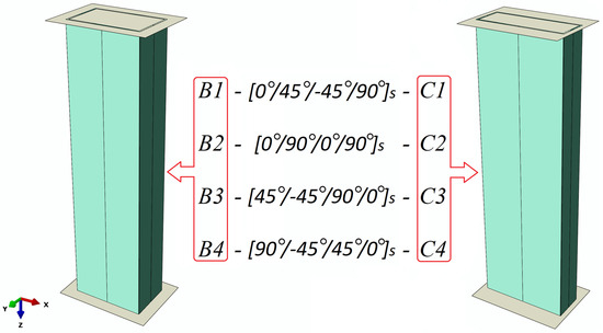 The numerical model consisted of a composite structure and non-deformable plate elements, which allowed correct modelling of the boundary conditions. The composite column with rectangular cross-section consisted of eight layers of composite material (CFRP) of equal thickness for both B- and C-type specimens. The numerical model included four different arrangements of fiber composite orientation shown in Figure 3. The composite structure had the same geometric parameters regardless of the arrangement of the composite material layers used. Both experimental studies and numerical simulations considered the following cases of arrangement of composite material layers: B1 and C1—[0°/45°/−45°/90°]s, B2 and C2—[0°/90°/0°/90°]s, B3 and C3—[45°/−45°/90°/0°]s, B4 and C4—[90°/−45°/45°/0°]s, as shown in Figure 3.