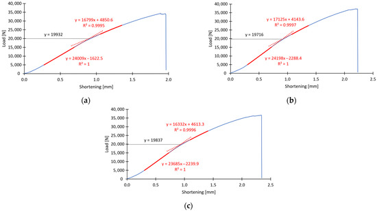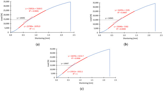 Consequently, the approximation method made it possible to determine the approximate value of the critical load within the experimental load-shortening curve.