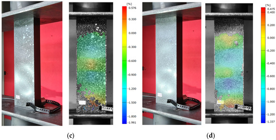 Moreover, experimental studies also allow one to determine the path of post-buckling equilibrium. Such studies are carried out until the complete failure of the specimen and provide an opportunity to capture the ultimate failure force, i.e., the maximum load that the profile can carry. These tests were conducted on a universal testing machine, as mentioned elsewhere. The total number of specimens tested was 24 (12 specimens of type B and 12 specimens of type C). Axial compression tests were performed using special heads with flat working surfaces that were parallel to each other. These heads were rigidly attached to the bottom of the testing machine and to the top crosshead. Figure 2a illustrates the test stand with the heads installed on the machine. In addition, a vision-based system for measuring the deformation of the profile at the very moment of critical load application—the ARAMIS 2D digital image correlation system [44,45]—was used. The use of the referred device enables, in particular, the observation and measuring of deformations at the moment of the loss of stability of the structure (buckling). Figure 2b presents the test stand with the vision system employed. In order to obtain valid deformation values using the ARAMIS 2D system, dedicated non-reflective, red-colored mats were used as a background for the tests. When too much illumination is applied to the specimen during the test, unwanted overexposed areas appear within the composite profile, which have an adverse effect on the deformation registration of the structure. The use of a non-reflective background eliminated the problem with overexposed areas due to the fact that the mats absorb excess illumination and neutralize this unwanted effect. In order to obtain accurately captured images of profiles in the axial compression test, proper lighting is required, which was achieved using LED lamps.