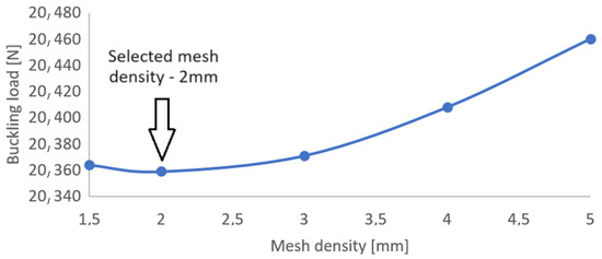 For numerical simulations using FEM, the critical state analysis was carried out based on the solution of a linear eigenproblem. During the preparation of numerical models, the effect of mesh density on the value of critical load was made (Figure 9). The study was carried out on a sample specimen B1 that made it possible to estimate the value of critical load—the most consistent with experimental results (a mesh density of 2 mm was adopted).