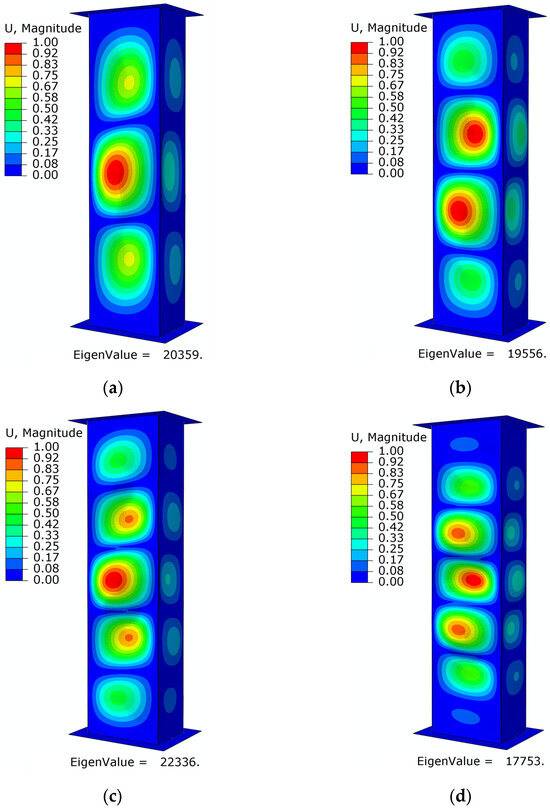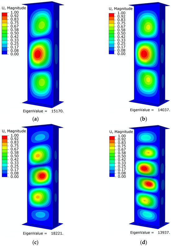 Loss of structural stability—numerical studies: (a) specimen type B1, (b) specimen type B2, (c) specimen type B3, (d) specimen type B4.