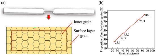 Figure 3b shows the surface layer grain proportion curves of specimens with different grain sizes. As the grain size increased, the proportion of surface layer grains increased. When the grain size was 23.3 μm, α was 25.1%. However, when the grain size was 84.8 μm, α reached 86.1%, which led to an obvious softening effect of flow stress.