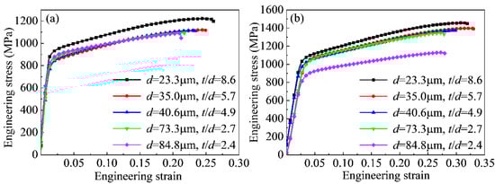 The engineering stress–strain curve has universal significance because the curve reflects various deformation processes such as plasticity, yield, and fracture that occur in the material under the action of external forces. Figure 4 shows the micro-tensile engineering stress–strain curves of the Ni-Co-based superalloy at room temperature and ultra-low temperatures. The engineering stress increased with the engineering strain under the same grain size due to work hardening. Additionally, the engineering stress gradually increased with decreasing grain size under the same engineering strain due to grain boundary strengthening. At the same deformation temperature, the stress of the specimen decreased significantly with decreasing t/d. When t/d decreased from 8.6 to 2.4, the tensile strength σb decreased from 1221 MPa to 1090 MPa, and the yield strength σs decreased from 793 MPa to 622 MPa at room temperature. When t/d decreased from 8.6 to 2.4, σb decreased from 1458 MPa to 1132 MPa, and σs decreased from 917 MPa to 730 MPa at ultra-low temperatures. The engineering stress of the micro-tensile specimen with a grain size of 84.8 μm increased with increasing engineering strain. However, the increasing degree of engineering stress was slightly lower compared to those of micro-tensile specimens with other grain sizes. This was because the surface layer grain deformation was less constrained due to the existence of the free surface, and dislocations were not easily accumulated in the surface layer grains, resulting in a reduction in the strain hardening ability of the surface layer grains and lower deformation resistance. At the same t/d, the stress of the specimen increased significantly with decreasing deformation temperature. It could be inferred that the ultra-low temperature was beneficial in improving the strength of the materials. The elongation of the alloy was better due to the matrix γ phase of the face-centered cubic (FCC) structure. When t/d decreased from 8.6 to 2.4, the elongation decreased from 0.26 to 0.21 at room temperature, and the elongation decreased from 0.31 to 0.28 at ultra-low temperatures. As the proportion of the surface layer grains increased, the number of grains contained in the thickness direction decreased, weakening the deformation coordination ability. Thus, the elongation of the Ni-Co-based superalloy decreased with decreasing t/d. At the same t/d, the elongation of the specimen increased significantly with decreasing deformation temperature. In summary, the strength and elongation of materials under the ultra-low temperature conditions were significantly better than those at room temperature. Therefore, ultra-low temperatures had a strengthening and plasticizing effect on the Ni-Co-based superalloys.
