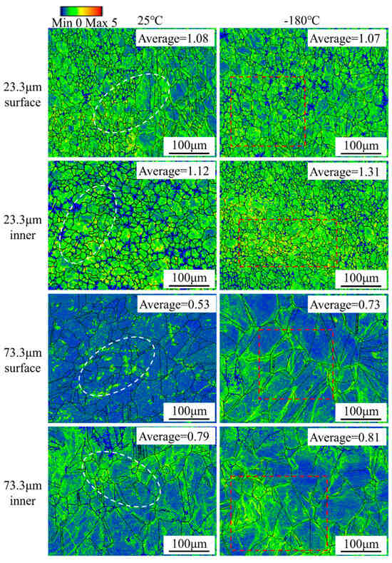 As shown in Figure 5, at room temperature, the average KAM values of the surface layer and internal grains of the specimen with a grain size of 23.3 μm were 0.65 and 0.76, respectively; the average KAM values of the surface layer and internal grains of the specimen with a grain size of 73.3 μm were 0.26 and 0.48, respectively. At ultra-low temperatures, the average KAM values of the surface and internal grains of the specimen with a grain size of 23.3 μm were 0.67 and 0.80, respectively; the average KAM values of the surface and internal grains of the specimen with a grain size of 73.3 μm were 0.29 and 0.57, respectively. The KAM value of the specimen with a grain size of 23.3 μm was relatively evenly distributed within the grain. The specimen with a grain size of 73.3 μm had a concentrated area of KAM value. As the grain size increased, the deformation ability of the alloy became worse. Additionally, compared with the deformation of internal grains, the deformation coordination ability of surface layer grains was poor. When there are only a few grains in the thickness of the specimen, the grains in the surface layer are less obstructed. Considering that the orientation of individual grains in the surface layer grains is randomly distributed, the inhomogeneous deformation of surface layer grains becomes more significant. Therefore, the average KAM value of the surface layer grains for the specimen with a grain size of 73.3 μm was the smallest.