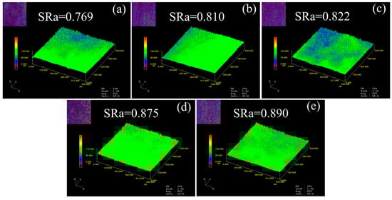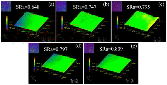 Figure 7 and Figure 8 show the surface roughness distribution of micro-tensile specimens at room temperature and ultra-low temperatures, respectively. “Peaks” and “valley” morphologies were observed on the surface of the specimen. When the grain size increased from 23.3 μm to 84.8 μm, the surface roughness of the specimen increased from 0.769 to 0.890 at room temperature and increased from 0.648 to 0.809 at ultra-low temperatures. The results show that the increase in grain size intensified the surface roughening of deformed specimens at the mesoscopic scale. Additionally, the differences in “peaks” and “valley” morphologies may be large in local areas of the specimen surface after deformation. However, SRa represents the average roughness of the smaller observation area. Thus, the variation is very little in surface roughness.