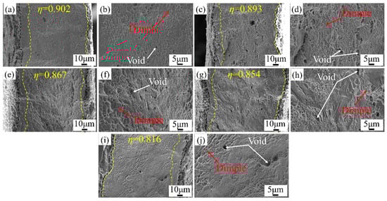 Fracture morphology of micro-tensile specimens at ultra-low temperature. (a,b) d = 23.3 μm; (c,d) d = 35.0 μm; (e,f) d = 40.6 μm; (g,h) d = 73.3 μm; (i,j) d = 84.8 μm.
