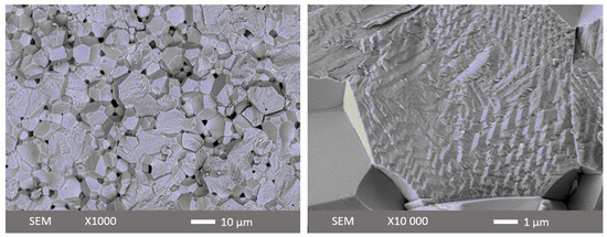 Figure 1 shows two illustrative SEM images of a fresh fracture surface for the 0.6BFO-0.2PT-0.3ST ceramic. The surface features of the broken granules reveal equiaxed grains and randomly oriented domains. It is evident that these grains exhibit rather large dimensions, exceeding 100 nm. The grain size was determined by measuring a substantial number of grains in SEM images. The microstructure of ceramics does not depend much on the composition as shown in Supplementary Materials Figure S1. All binary and ternary ceramics produced in this work exhibit an average grain size of about 4–7 μm. An earlier study on BFO-PT ceramics reported a grain size of about 1 µm [1], while single-phase BFO sintered to a fully dense state could have a grain size of 10 µm [2]. The increase in the grain size in the ternary system with respect to the binary system might be due to a decrease in tetragonality upon the addition of ST. The relative density of the samples made was at least 97%. No significant correlation between sintered density and composition was identified.