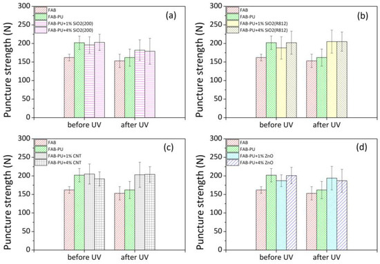 Chicago/Turabian StyleAcierno, Domenico, Lucia Graziosi, and Antonella Patti. 2023. "Puncture Resistance and UV aging of Nanoparticle-Loaded Waterborne Polyurethane-Coated Polyester Textiles" Materials 16, no. 21: 6844. https://doi.org/10.3390/ma16216844
