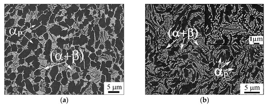 The initial duplex structure of the VT8M-1 alloy consists of a primary globular α phase (αp) and a+β transformed lamellar matrix (Figure 1a and Figure 2a). The fraction of the globular α phase and mean size of α particles were measured to be 68% and 4.5 μm, respectively. The β transformed matrix consisted of α and β laths about 0.2 µm thick (Figure 1a).