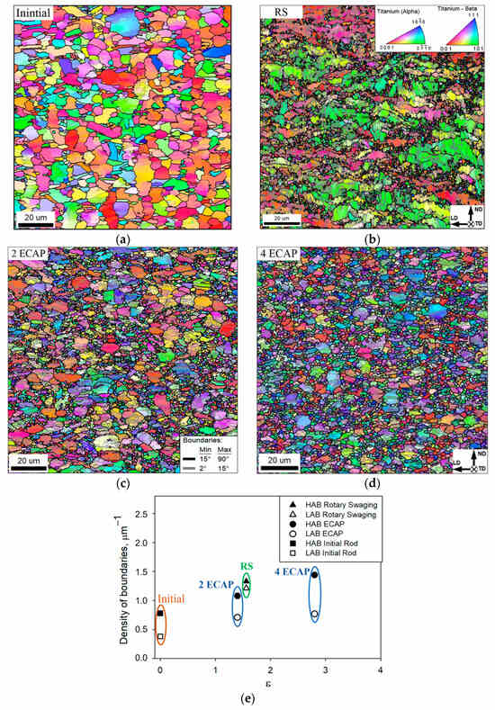 The evolution of the low- and high-angle boundaries was studied using a grain-boundary-density measure. After RS, the densities of LABs and HABs were comparable to each other, being 1.21 µm−1 and 1.33 µm−1, respectively (Figure 2e and Table 1). In contrast, two ECAP passes provided a completely different ratio of LABs and HABs. Specifically, the density of HABs was measured to be ~1.08 µm−1, while that of LABs was only ~0.71 µm−1. Four ECAP passes resulted in an increase of the density of HABs to 1.14 µm−1, while the density of LABs remained as low as ~0.77 µm−1. The predominance of HABs in the microstructure after 4 ECAP passes indicated a prevalence of the recrystallized microstructure. This suggestion was in line with the equiaxed microstructure morphology in this material condition (Figure 2d).