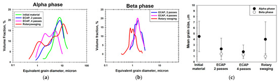 The bimodal microstructure was also formed after two ECAP passes (Figure 2c). It consisted of the comparatively fine (~1.4 µm) β grains and the globular primary-α grains of 2.3 µm in diameter (Figure 3a,b). The further increase in ECAP strain to four passes led to a refinement of the α-grains to 1.8 μm (Figure 3a, Table 1). On the other hand, the mean size of the β grains remained nearly unchanged (Figure 3b, Table 1).
