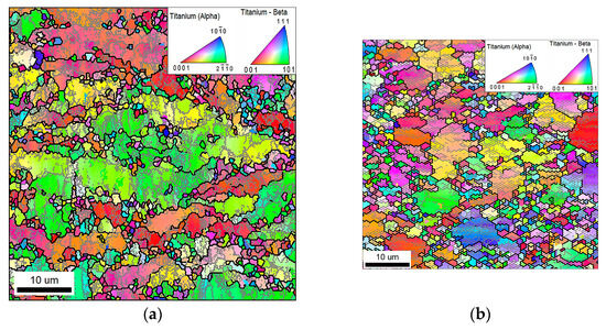 The following supporting information can be downloaded at: https://www.mdpi.com/article/10.3390/ma16216851/s1. Figure S1: EBSD orientation maps of beta-phase taken from the (a) material after RS (ε = 1.56) and (b) material after 4 ECAP passes (ε = 2.8). The individual grains in the maps are colored according to their crystallographic orientation; the color code triangle is shown in the top right corner of (a).