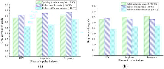 According to Equation (7), the transmission of an ultrasonic pulse in an asphalt mixture is related to the mechanical properties parameters of the asphalt mixture. To analyze the relationship between the UPP and mechanical properties of asphalt mixtures, the correlation between the UPP and properties parameters of asphalt mixtures at low, normal, and high temperatures is calculated by the grey correlation algorithm. The analysis results are shown in Figure 10.