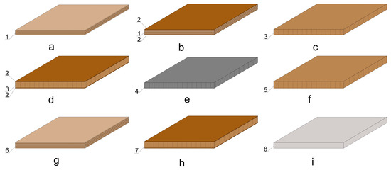 Types of thin and ultra-thin structural wood-based and non-wood materials: (a)—9 mm birch veneer plywood (1); (b)—9 mm birch veneer plywood (1) laminated with 0.8 mm thick high-pressure laminate (2) (HPL); (c)—10 mm medium-density fibreboard (3) (MDF); (d)—10 mm MDF (3) laminated with 0.8 mm HPL (2); (e) —10 mm black MDF (4); (f)—12 mm MDF (5); (g)—12 mm plywood with birch face veneer (6); (h)—12 mm laminated particleboard (7) (LPB); and (i)—10 mm compact HPL (8).