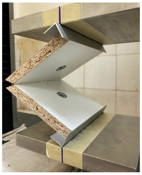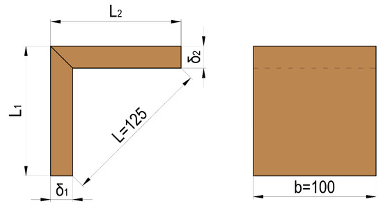 An L-type joint was selected for the purpose of this study. The type of joints and dimensional parameters of the test samples, made in accordance with the testing method described by Kyuchukov and Jivkov [28], are shown in Figure 2. The dimensions δ1 and δ2 are equal and correspond to the thickness of the panels. The dimensions L1 and L2 are also equal and depend on the thickness of the panels. For each series of joints, 15 test samples were made.