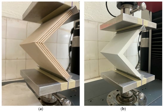 Test samples during testing: (a) test sample made of plywood; (b) test sample made of compact HPL.