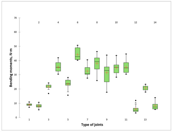 The results for the bending moment of end-corner joints of thin and ultra-thin materials are given graphically in Figure 7. Table 3 shows the Tukey’s HSD analysis of the differences between the groups with a confidence interval of 95% of bending capacity of mitre joints made of thin and ultra-thin structural elements of all pairwise comparisons. The joints are ranked in descending order of bending moments.