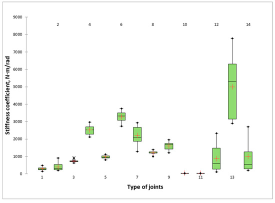 Stiffness coefficients of mitre joints made of thin and ultra-thin structural elements. The number index of the type of joints is based on the data presented in Figure 3.
