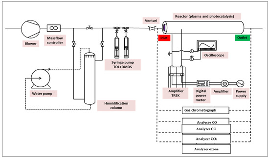 The oxidation (photocatalysis and plasma) runs were conducted using the experimental setup shown in Figure 1. It consists of a tubular cylindrical reactor formed by two concentric Pyrex tubes (100 cm long), one outer tub of 76 mm, and an inner tube of 58 mm. Their wall thickness was about 4 mm. The reactor can be combined with (i) photocatalysis by using an external UV lamp (Philips TL 40W/05 (Philips, Canton of Flayosc, France)) and/or (ii) DBD plasma (Dielectric Barrier Discharge system) by applying high voltage power. Experiments were realized at ambient temperature (25 °C) and atmospheric pressure. A TESTO sensor is used to measure the temperature and relative humidity. Before photocatalytic experiments, the UV lamp (100 cm long, in the inner concentric cylinder) is activated for homogeneous irradiation. The flow rate (a maximum of 10 m3.h−1) at the system’s inlet is controlled using a mass flow meter (Bronkhorst In-Flow). For humidity experiments (from 5 to 90 ± 5%), a variable part of the airflow is derived through a packed column where water flows in the counter current (Figure 1). Two syringe/syringe driver systems (KD Scientific Model 100) were used continuously for liquid Toluene and DMDS injecting into the gas stream. A heating band was used in the injection zone to achieve a good evaporation of pollutants (Figure 1).