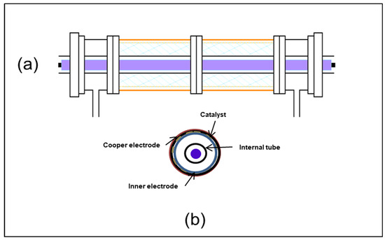 In recent years, investigations have demonstrated the effectiveness of dielectric barrier discharge (DBD) reactors for hazardous pollutant removal from gas streams with low VOC concentrations at ambient temperatures [7]. The simultaneous reduction in coexisting pollutants has also been studied [8]. Despite its good attributes, DBD plasma has some drawbacks, such as the formation of toxic by-products like CO, NO, NO2, and O3. Achieving the desired total oxidation of CO2 and H2O is often challenging [9,10,11,12]. To address these challenges, coupling DBD plasma with photocatalysis presents a ‘zero waste and zero reagent’ technology with the potential for synergy and low energy consumption [13,14]. Several studies have investigated the coupling of DBD plasma and photocatalysis using different reactor types and targeting various odorous compounds, including isovaleraldehyde, isovaleric acid, trimethylamine, ammonia, and dimethyl disulfide (DMDS) [15]. It is known that the presence of a catalyst in the plasma enhances performance [16,17,18,19]. To avoid catalytic surface poisoning and maintain energetic efficiency, producing a higher concentration of reactive species through the controlled adjustment of the pulsed discharge conditions is crucial, as these species have very short lifetimes [18,19,20,21].