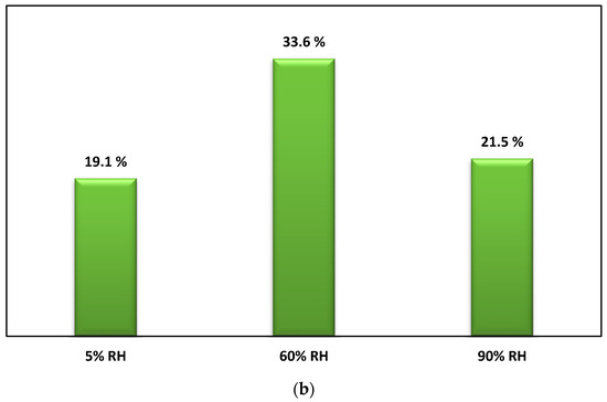The influence of humidity levels was also investigated by maintaining a constant inlet toluene concentration (10 mg.m−3) and an airflow rate of 2 m3.h−1 while varying humidity levels at approximately 5%, 60% ± 5, and 90% ± 5 using a humidification column. Two distinct behaviors in toluene removal were revealed in Figure 3b. At lower humidity levels (<60% ± 5), an improvement in toluene removal was observed due to active intermediate species generated under these conditions, enhancing the oxidation step and overall photocatalytic toluene removal. Favorable toluene removal efficiency was demonstrated in the experiments at approximately 60% ± 5 humidity levels, increasing efficiency from 19 to 33.6%. However, at higher humidity levels (>60–90%), competitive adsorption between water vapor and toluene molecules on active sites became more pronounced, decreasing toluene removal efficiency. At high humidity levels (90% ± 5), a slight decrease in toluene removal efficiency to 21.5% was observed. The significance of humidity as an experimental parameter in photocatalytic oxidation processes is highlighted by our comprehensive analysis, with lower humidity favoring toluene removal and higher humidity exerting a negative impact. Thus, increasing the relative humidity inside the reactor results in a net presence of water molecules. The water molecules adsorbed on the surface of the photocatalyst result in photogenerated holes following oxidation leading to the formation of OH radicals known as reactive species in the photocatalytic air treatment. On the other hand, the significant presence of water vapor molecules at high relative humidity levels reverses the trend and reduces the conversion of the pollutant due to the phenomenon of competition between the water molecule and the adsorption of ethylbenzene on the active sites of the photocatalyst [5].