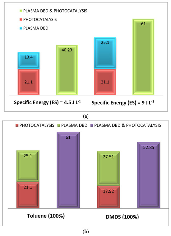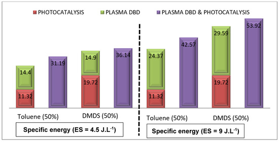 The same methodology was applied to the mixture of toluene and DMDS. Figure 6 illustrates the removal efficiency of the toluene/DMDS mixture using three processes: (i) photocatalysis, (ii) DBD plasma, and (iii) photocatalysis/plasma at different plasma energies. For the mixture studied, the reactor was supplied with: a humid air flow (2 m3.h−1, 55% humidity), an inlet concentration of 14 ppm ([Toluene] = [DMDS] = 7 ppm), and plasma energies of 4.5 and 9 J.L−1. As depicted in Figure 6, plasma energy is a crucial parameter for monitoring plasma application and it can significantly impact degradation efficiency.