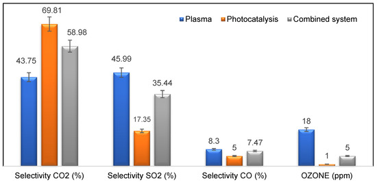 In this investigation, the selectivity rates of carbon dioxide (CO2), sulfur dioxide (SO2), and carbon monoxide (CO) under different oxidation conditions were analyzed. Figure 8 presents the experimental data, showcasing distinct selectivity rates for these pollutants. Carbon dioxide (CO2) exhibited the highest selectivity rate among the three, achieving 69.81% through photocatalysis alone, 43.75% through plasma alone, and a further increase to 58.98% when plasma and photocatalysis were combined. On the other hand, sulfur dioxide (SO2) showed a selectivity rate of 17.35% through photocatalysis, while plasma alone achieved 46%. However, the combination of plasma and photocatalysis resulted in a decreased selectivity rate compared to CO2. For carbon monoxide (CO), selectivity rates were negligible, with only 7% of the CO mineralization rate observed through photocatalysis, plasma, and plasma/photocatalysis.