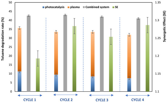 Figure 9 presents the degradation rate of toluene in the mixture and the synergetic effect (SE) value after four cycles (each cycle consisting of experiments with photocatalysis, plasma, and their combination). It can be observed that the degradation rate of toluene slightly decreases after four cycles of continuous oxidation, resulting in a 10% loss of the catalyst’s photoactivity. However, a stable degradation rate is observed when the coupling of plasma/photocatalysis is applied. In our case, the regeneration step involved using photocatalysis/plasma.