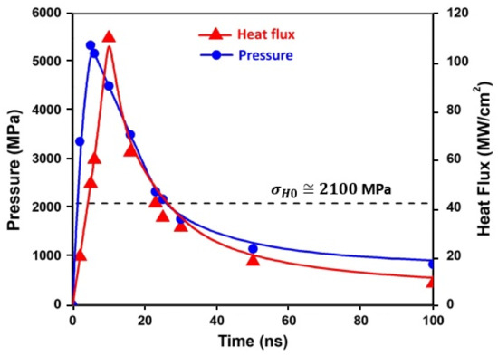 The application of a peak laser intensity of 20 GW/cm2 forces a sudden vaporization of the irradiated surface, leading to a very high-temperature plasma (about 30,000 K). This causes additional local near-surface plastic strains. The time–heat flux exchange between the confined plasma and the irradiated surface can be calculated with the aid of the HELIOS code. The time irradiation pulse, , the heat flux, , and the corresponding pressure, , are represented in Table 2. Both the heat flux, , and the pressure, , are plotted together in Figure 2, in which a slight delay is observed between both profiles. This is consistent with the results reported by Morales et al. [50]. The pressure pulse is set in ABAQUS with the aid of user subroutine VDLOAD.