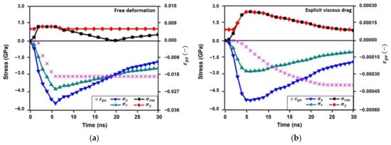 In summary, the results presented in this section confirm both qualitative and quantitative differences are presented when the viscous drag is explicitly considered. The pressure decay beyond the maximum shockwave amplitude plays a very important role in plastic deformation. In fact, it is responsible for extending the time in which deformation rates about 104 s−1 take place. This fact justifies that reasonable deformations are obtained (with their corresponding conventional residual stresses) although much lower deformation rates are involved.