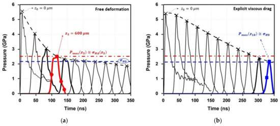 Figure 4 shows the computed time evolution of the shockwave amplitude for the selected representative depths. A linear decrease in the maximum pressure, , is computed by means of conventional modeling from the surface of the material, from (where 5.3 GPa) to = 600 μm (where the strain rate decreases drastically). Furthermore, the results provided when the drag stress is considered (Figure 4b) show that the in-depth pressure decay is softened. As expected, the shockwave loses a greater amount of energy due to the higher magnitude of plastic deformation when the viscous drag is neglected. Therefore, the plastic strain near the surface is higher but a lower affected depth is computed (Figure 5).