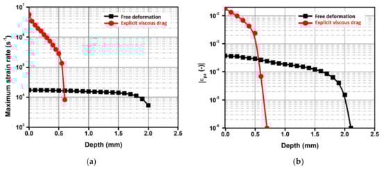 (a) In-depth maximum plastic strain rate. (b) In-depth axial plastic strain.