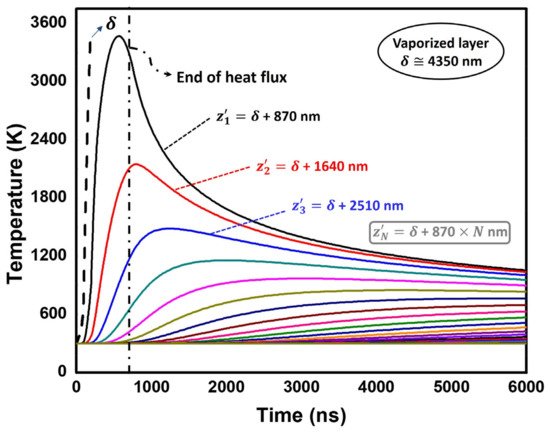 The heat flux (Table 1) is set as an input to calculate the temperature evolution for different depths (Figure 6). As expected, the results suggest that a thin layer may exceed the vaporization temperature. This result is consistent with the nature of LSP, in which evaporated material forms a plasma whose temperature increases up to 30,000 K. A simplified method is used to calculate material vaporization: if the surface element affected by irradiation reaches the vaporization temperature of the alloy (3500 K), the heat flux starts to affect the adjacent element. The results suggest that about the first 4.35 μm are vaporized per pulse, feeding the high-temperature plasma. It must be noted that the main purpose of the heat analysis is to obtain the time evolution of temperature near the surface, which is set as an input for plastic strain determination near the surface.