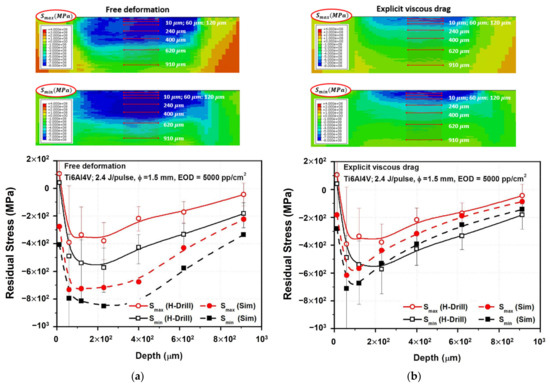 (a) Experimental vs. simulated in-depth residual stress profile predicted by conventional modeling. (b) Experimental vs. simulated in-depth residual stress profile with explicit consideration of viscous drag phenomenon.