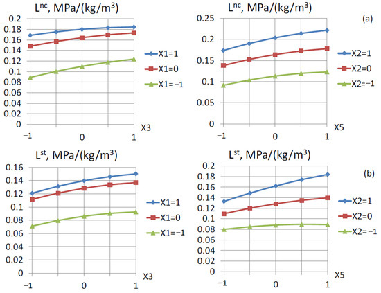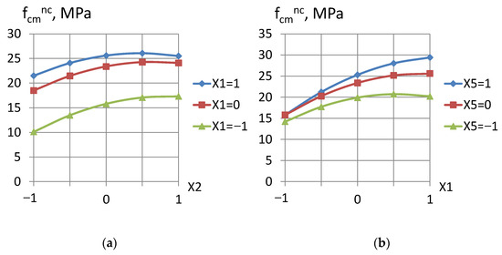There was a significant interaction of factors X1 and X5 in the models (Equations (10) and (11)), which is evident in Figure 1b. This interaction showed an increase in activator effectiveness when the superplasticizer content in concrete increases. An increase in the superplasticizer content neutralizes the negative effect of the activator’s (microsilica) large specific surface area on the concrete mixture’s water demand and, accordingly, causes a positive effect on the strength.