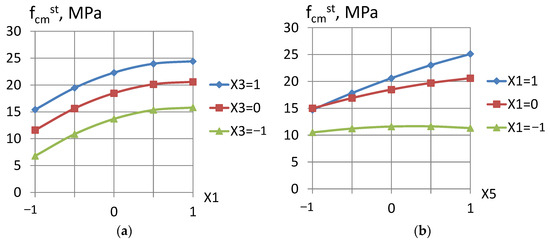 Analysis of the obtained models shows that the concrete strength varied in the range from 4.1 to 33.1 MPa for normal curing and from 0.2 to 29.7 MPa after steaming. The transition of all the studied factors’ values from the lower to the upper level helped to increase the concrete strength. The highest impact on the increasing strength was factor X1 (part of the activator (microsilica) in the volume of mineral additive). A lower effect was caused by factor X2 (part of the mineral additive in the binder) (Figure 1a). Factor X5, which characterizes the superplasticizer content, had a quite noticeable influence (Figure 1b). Factor X4 characterizes the cement paste content in the total volume of concrete. When changing within the specified range, this factor had virtually no effect on the strength characteristics. According to A.M. Neville [23], the ratio between aggregate and cement is a secondary factor for concrete strength, especially for medium and low concrete classes; however, it has been found that constant W/C lean concrete mixtures have higher strength. It is suggested that this trend is due to the water absorption by the aggregate: more aggregate absorbs more water, and the effective water–cement ratio decreases.