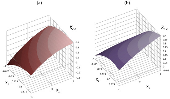 Response surfaces of the cementing efficiency coefficient (Kc.e) of activated fly ash at concrete normal curing vs. the interaction of factors: (a) X1–X2, (b) X1–X5.