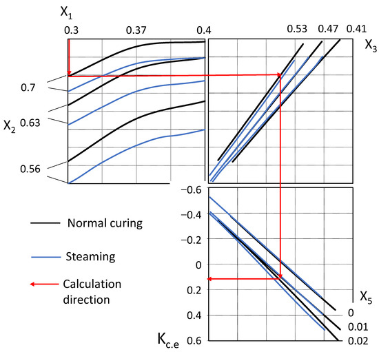 For a known consumption of the active mineral additive, cement, and superplasticizer, it is possible to find the cementing efficiency coefficient for the mineral additive using the obtained experimental and statistical models (14–15). For a more convenient graphical solution of the mathematical models (Equations (14) and (15)), a Kc.e nomogram was obtained (Figure 5). According to this nomogram, for the known concrete composition indicators, it is possible to find the value of the active mineral additive cementing efficiency coefficient and use it to calculate the concrete composition with given properties.