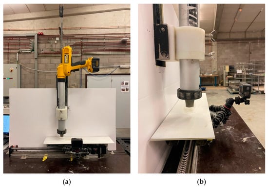 (a) Front and (b) side view of custom-made setup for small-scale printing, consisting of an electric silicone gun positioned on top of a moving platform. A digital camera was placed on the platform allowing for real-time recording of the printing.