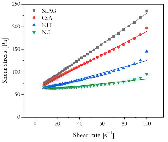 Flow curve of analyzed mortars. The line represents the fit to the Bingham model.