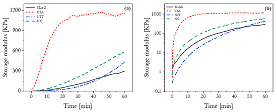 Evolution of storage modulus with time under a strain amplitude of 5 × 10−4% in (a) linear and (b) logarithmic scales.
