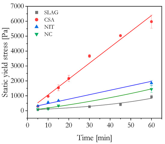 In terms of the NIT mixture, the beginning of the flow onset measurements revealed relatively close static yield stress values when compared to the CSA mixture. However, after approximately 10 min, a clear distinction emerged as the CSA curve experienced a sharp increase due to its high structural kinetics.