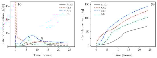 The NIT cumulative heat curve, on the other hand, displayed a change in slope direction, with a sharp increase starting around 2.5 h after the beginning of the test, surpassing the CSA curve after 4 h. This aligned with the end of the dormant period and the beginning of the acceleration period. However, it remains unclear why the cumulative heat of the NIT mixture was significantly higher than that of the other mixtures, including CSA. This discrepancy suggested that the reaction process in the NIT mixture underwent a higher degree of acceleration, which did not agree with other experimental findings.