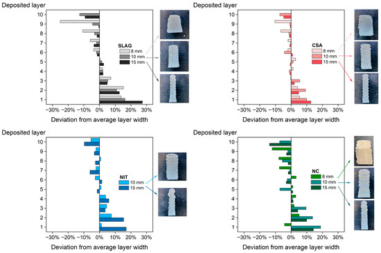 Upon examining the final layer width, it became evident that the SLAG mixture exhibited the highest variation from the average values, indicating variability in layer width throughout the element height, and it had a significantly larger bottom layer width. This occurred because, when there is pressing, the layer height is mainly determined by the position of the printing nozzle, while various printing parameters, such as robot velocity, material flow rate, and nozzle deposition height, influence the layer’s width.