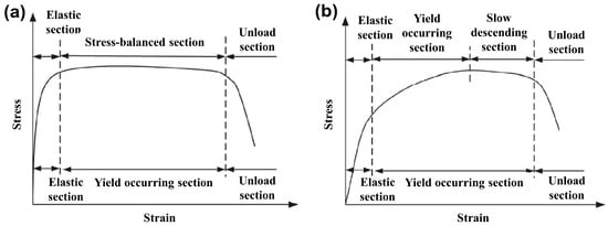 Stress–strain curves of solid propellants with (a) small particle size and (b) large particle size [,].