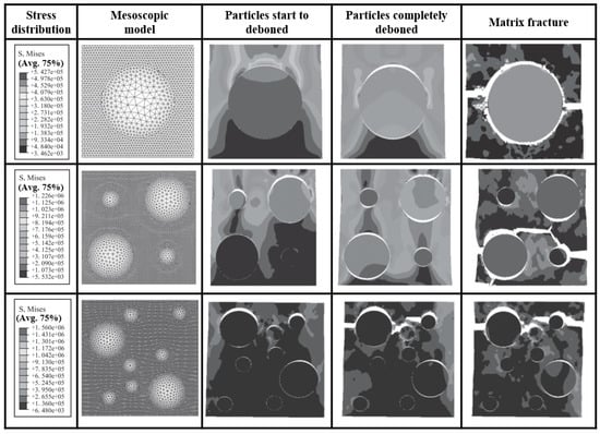 The particle-filled composite material was originally designed as a periodic distribution of single cells to realize the simplified mesostructure model of a composite solid propellant. Fang and Ning [] investigated the effect of hexahedral and cuboid monocell arrangements on the effective modulus of particle-reinforced composites by numerical simulation. Peng et al. [] established a viscoelastic finite element model of a composite solid propellant based on cylindrical cells and calculated and analyzed the stress distribution, damage location and form of the particle interface and matrix. Marur [] calculated and analyzed the effective elastic modulus of particle-reinforced composites with a periodic distribution and the stress distribution of spherical particles under a uniaxial tensile load. Yuan et al. [] established an axisymmetric unicellular model of a composite solid propellant and found that the stress field around the particles interacted. The larger the particles, the stronger the interaction, and the stress bands were easily formed, showing stress concentration. The smaller the particle, the smaller the interaction and the less obvious the stress concentration. Zhou et al. [] established two-dimensional mesoscopic models of three solid propellants: a single particle, four particles and eight particles, and investigated the effects of particle number and size on the failure process of solid propellants through numerical simulation, as depicted in Figure 7. The results showed that the single-particle model was not sufficient to cause particle failure due to its high particle modulus. In the multi-particle model, the large particles were the first to deboned, and the matrix with a dense particle distribution was the first to break. The unicycle model and its periodic distribution model provided a simple method to analyze the mechanical properties of composite solid propellants and could determine the local stress–strain field inside the material. However, the simple and idealized element shape and particle distribution are not consistent with the actual situation, so they cannot be used for effective analysis.