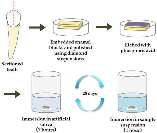 The materials used for the remineralization test are summarized in Table 1. The following five materials were applied to the enamel samples: commercially available gel containing sodium fluoride (1450 ppm)/cetylpyridinium chloride (Check-up gel Mint, Lion Corporation, Tokyo, Japan) (F), µB, nB, and nB+Z (nBZ) (Figure 1). The surface of the enamel samples was demineralized by etching treatment (15 s) with 35% phosphoric acid (3 M; Transbond XT Etching Gel, Monrovia, CA, USA). Then, a remineralization cycle test was performed for 28 days, alternating between 7-h immersion in a remineralization solution (pH 6.8) and 1-h immersion in the suspension of each test material. The concentration of the suspensions was adjusted with deionized water to 5.0 mg/mL for nB and µB and 200 µg/mL for Z. The remineralization solution used was artificial saliva adjusted to have a Ca/PO4 ratio of 1.67 by adding CaCl2 and NaH2PO4 to deionized water. CH3COOH and NaOH were used for pH adjustment. A sample immersed only in the remineralization solution was used as a control (Con).