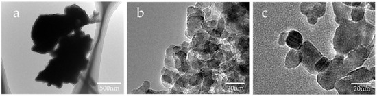 Representative TEM photomicrographs of the sample particles ((a) 10,000× magnification image of µB; (b) 200,000× magnification image of nB; (c) 200,000× magnification image of Z).